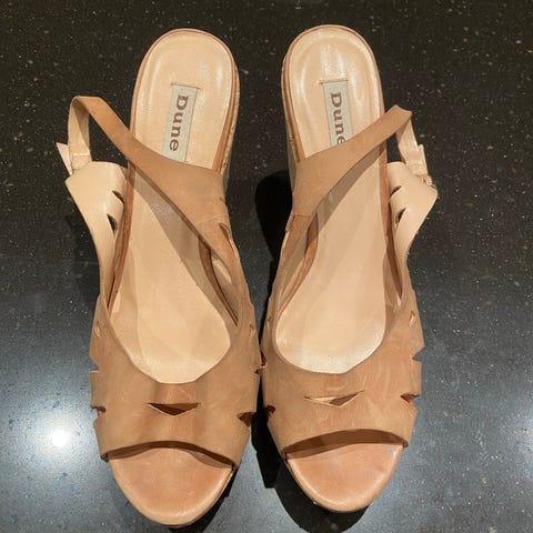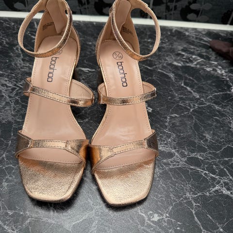 Använda vid ett tillfälle. Missfärgning på botten av klackarna (därav kraftigt sänkt pris).