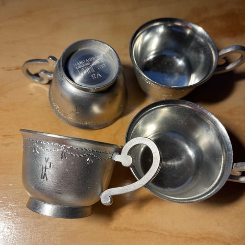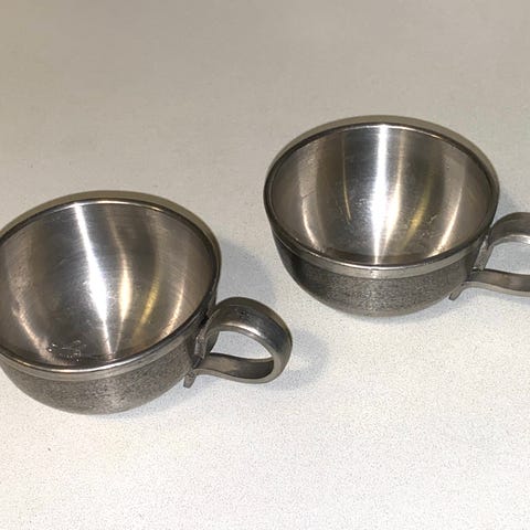 Två stycken tennmuggar med texten "Pripps" och "Apotekarnes Mineralvattens AB Stockholm" samt "Grundat 1874". Diameter fot 10,5 cm och topp 8 cm; höjd 12,5 cm. Botten är genomskinlig och där syns en darttavla, se andra bilden