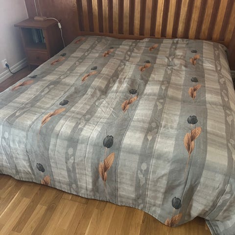 Svart överkast med undersida (vändbar sida) i silver. I mycket fint skick. Materialet är ”rejält”/ slitstarkt, en lätt glansig yta och ligger mycket snyggt på sängen. Märket heter Moltex.