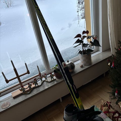 Rossignolbindning är monterad och är använd någon säsong, ingår