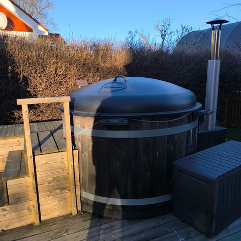 Badtunna med glasfiber insats, rymmer ca 8 personer. Reningsverk och vedeldad kamin.