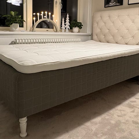 Bytte nyligen ifrån en kontinental säng till denna, och känner att jag trivs bättre med kontinental. Så säljer denna då jag redan beställt en ny. Sängramen heter Malm bäddmått 120cm . Då jag är lite allergisk emot vitt, så valde jag att dekorplast tejpa den i ljus ek samt så har jag satt textilpanel på. Allt går att ta av, MEN kommer göra inverkan på sängenramen. Köpte till valvågen medium/fast samt Norrsele bäddmadrass. Madrass skydd har alltid varit på! Inga fläckar! Allt är ca 1,5år, fint skick skulle jag säga.