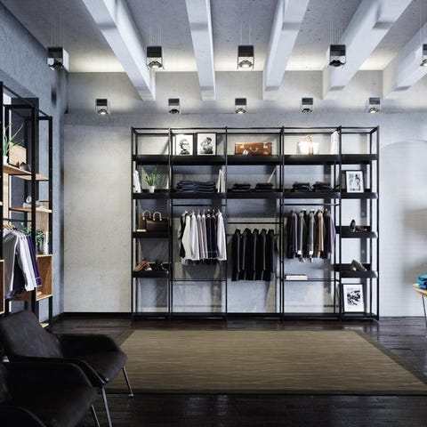 Set med träpaneler och hyllor för väggmontering, avsedda för förvaring eller visning. Panelerna har olika hyllplan i trä och kan användas för att organisera eller visa föremål. Butiksdisk med belysning i använt skick finnes också.