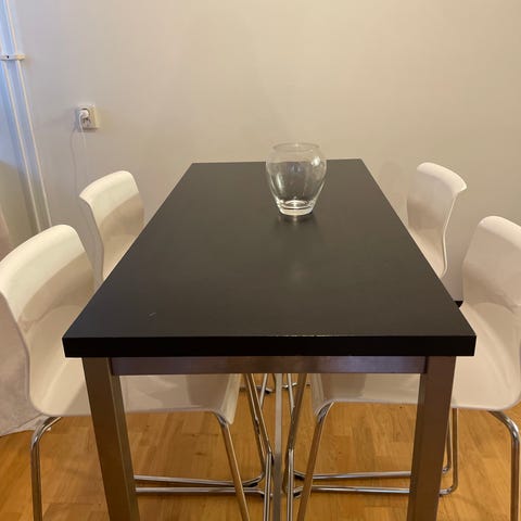IKEA matbord med vit bordsskiva och ett metallben, samt fyra svarta barstolar med metallram och svart sits. Bordet är rektangulärt med rundade hörn och passar för matplats eller kök. Barstolarna är designade för barhöjd och har fotstöd. OBS Måtten på bordet är ungefärliga men kan mätas exakt vid intresse! Finns i Växjö och hämtas upp av köparen! Mvh Marie