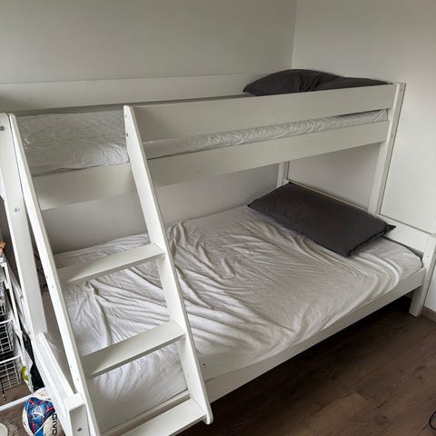 Vitlackerad, stabil våningssäng, perfekt för barn upp till tonåren. Tål upp till 80 kg vikt. Sängen har en stege för åtkomst till övre sängplats och är utformad för att spara utrymme i rummet. Gardinerna kan användas för att skapa en myshörna.