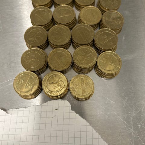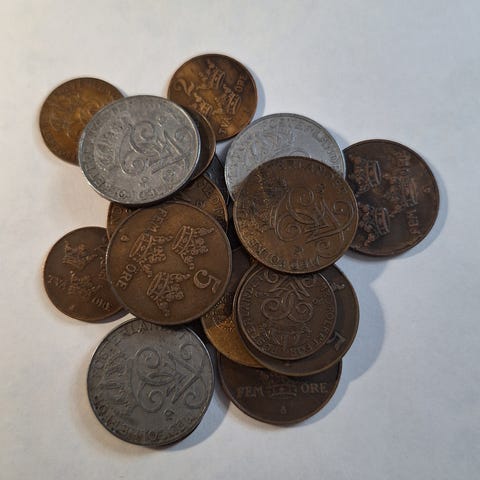 Ett antal äldre mynt i låga valörer . Täotalt 260 gram.