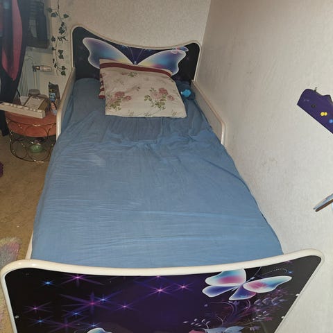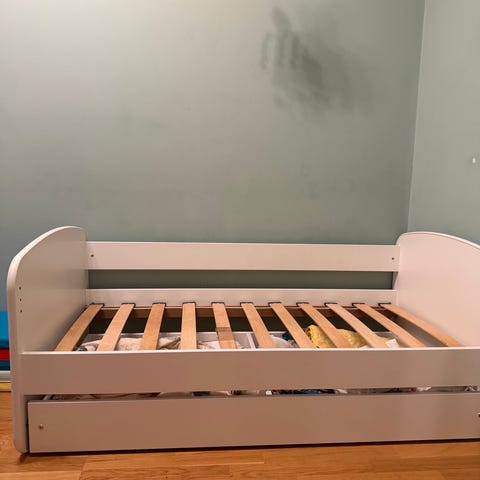 Säljer en fin vit barnsäng i bra skick. Sängen har ribbotten och en stor utdragbar låda under för praktisk förvaring av t.ex. leksaker, sängkläder eller kläder. Stabil och lätt att montera.