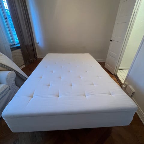 Resårbotten med bäddmadrass och ben i ljust trä. Medelfast. Överdraget till bäddmadrassen är fläckfritt, avtagbart och kan tvättas i 60°C. Rök- och djurfritt hem. Höjd på ben 20cm.