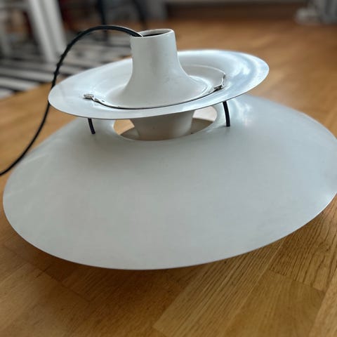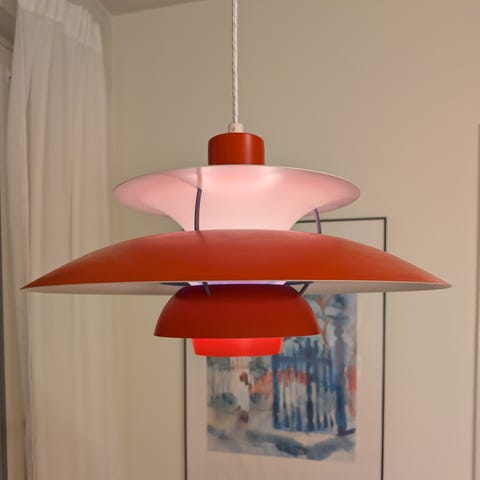 Säljer en original PH 5 (Poul Henningsen) pendel från 70-talet med klassisk fler-skärmsdesign i rött/vitt/blått. Tidlös dansk design, passar perfekt över matbord eller i kök/vardagsrum.