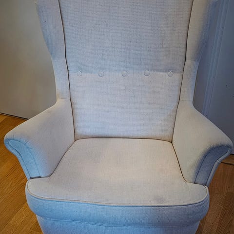 Beige fåtölj med manschestertyg från IKEA. Superfin!