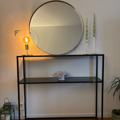 Avlastningsbord med stålram och vita glasskivor.