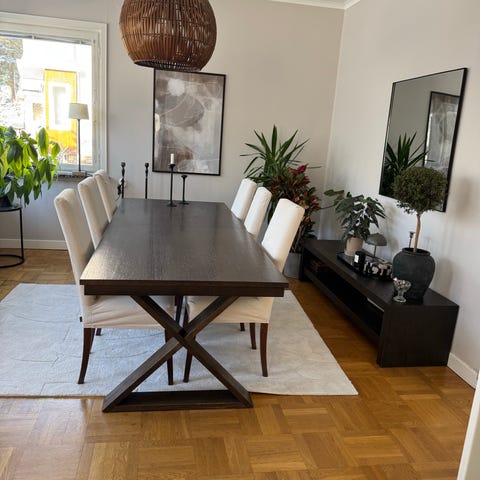 Ett superfint tungt svart matbord, 175 cm långt & 95 brett, i gott skick med normalt slitage. Bordet är utdragbart och har praktiska iläggsskivor som enkelt fälls ut när du drar isär bordet så att du slipper förvara de någonstans.