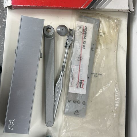 Dorma TS 83 dörrstängare levereras i originalförpackning med monteringsanvisningar. Produkten är avsedd för montering på dörrar och har funktioner för justering av stängningshastighet och slutning.