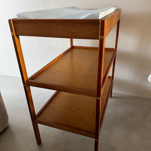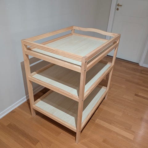 Jag säljer en unik skötbord/byrå i massivt trä. Den har fyra lådor (tre större och en mindre) och en skåp med två hyllor. Rymmer massor av saker och kan även användas som en vanlig byrå. Färgen har släppt på vissa ställen.