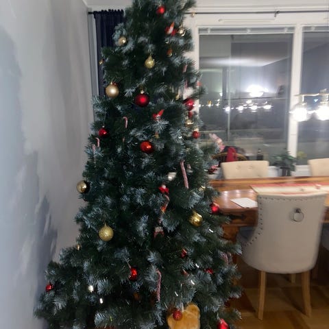 julgran plast, höjd 210 cm, väldig bra skick, se verklighet ut, många täta grenar, många julgranskulor, vackra olika färger, glitterband, Finns box till julgranen. Allt som du ser i bilderna får ni.