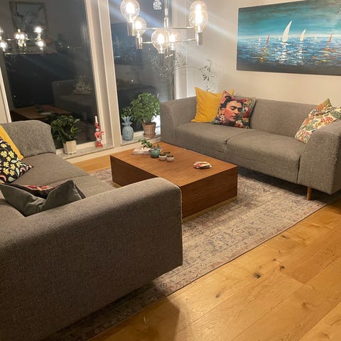 Säljer två st fina grå soffor från Mio. Djup 86 cm och längd 227 cm. På ena soffan har en knapp lossat på en av sittdynorna (se bild 5-6). ENDAST EN KVAR.