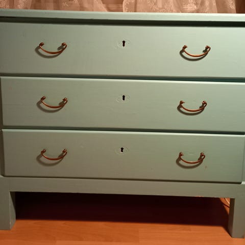 1. Svartbrun Malm-byrå, 4 lådor. B 80 H 100 D 49. 300.-