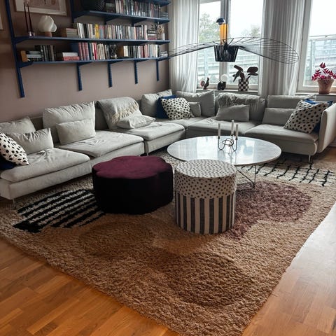 Enstaka fläckar och märken som enkelt kan döljas med soffbord eller liknande. Dammsugen och ihoprullad inför försäljning.