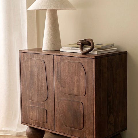 Skåp av lackad MDF med urfräst mönster på dörrarna. Ben av pulverlackad metall. Två fack utan hyllplan och vägg emellan. Dörrknoppar av mässingsfärgad metall.