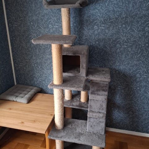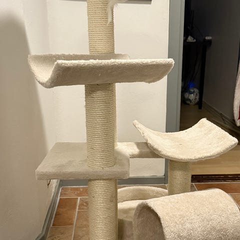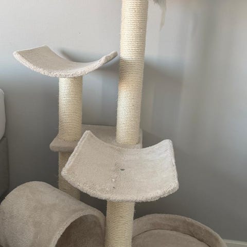 Kattklätterträd beige med flera plattformar och hängande leksak