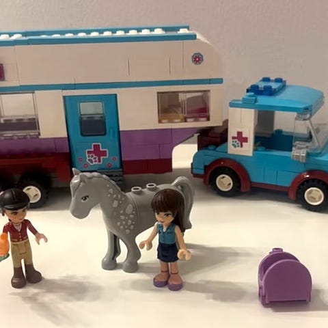 LEGO Friends lekset som inkluderar flera fordon i olika färger, hästar och minifigurer. Setet innehåller en blå bil med vit och röd detalj, en gul traktor, en vit och rosa cabriolet, en orange motorcykel samt tillbehör som ramper och hinder. Omg instruktioner finns med