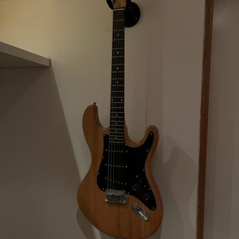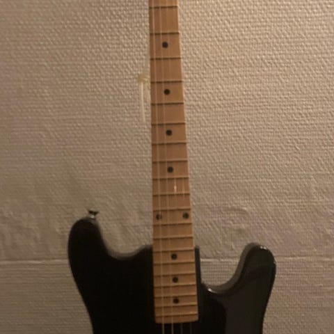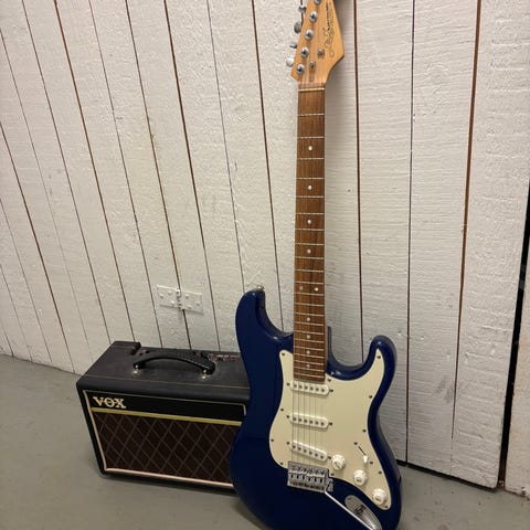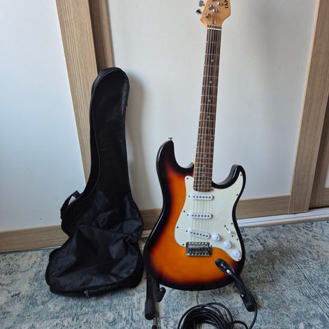 Elgitarr med tillhörande förstärkare och anslutningskablar. Gitarrsträng, gitarrställ, förstärkare och kablar. Använd cirka fem gånger , sonen fick den i julklapp men slutade sedan spela. Så i princip oanvänd.