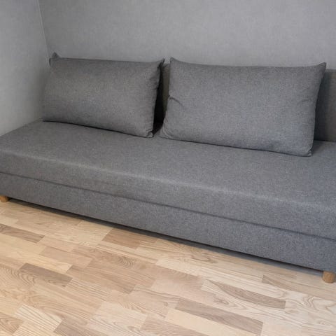 Mörkgrå bäddsoffa från Ikea med förvaring och 3 ryggkuddar.