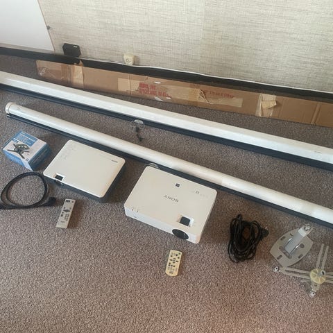Ingår en 120" duk, tak- och väggfästen samt extra långa HDMI-kablar.