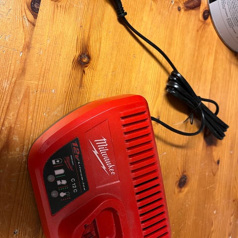 Milwaukee M12 M18 batteriladdare i röd färg. Laddaren är avsedd för att ladda Milwaukee M12 och M18 batterier.