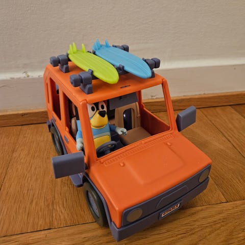 Bluey bilen med surfbrädor och figurer. Inkluderar en orange 4WD-familjebil, surfbrädor och Bluey-figur.