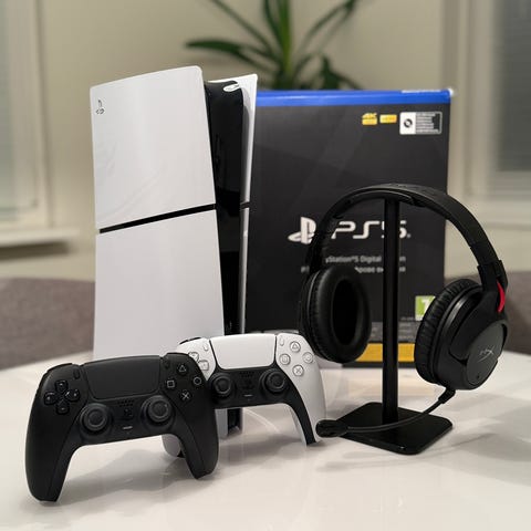 PlayStation 5 Spelkonsol i vit färg. Kommer med två trådlösa handkontroller. Designad för spel och underhållning med avancerad hårdvara och snabb prestanda