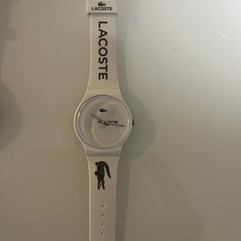 Lacoste Herrklocka med guldfärgad länk och safirglas. Klockan har en svart urtavla och är tillverkad i övrigt material med safirinslag. Designad för män. Använd inte mycket 2 år gammal