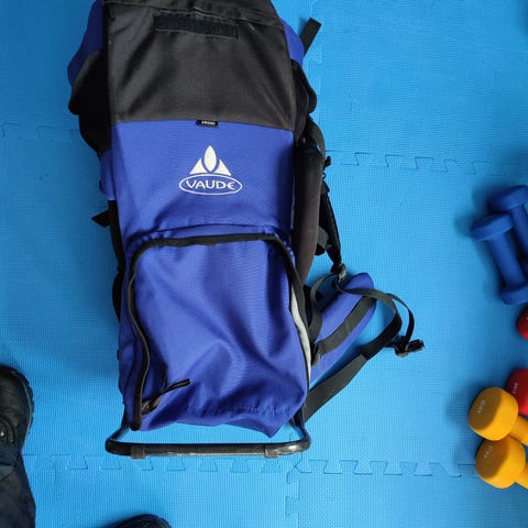 Bekväm, praktisk och kompakt bärstol i gott skick. Vissa tecken på användning finns. Exempelvis har plasten på regnskyddet/solskyddet som kan fällas upp vid behov tyvärr gulnat något. Färgen är grå.