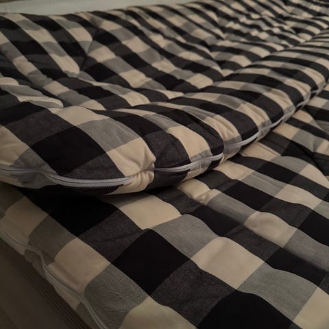 Hästens säng med justerbar funktion+massage i båda sänghalvorna. Sängen är klädd i ett rutigt tyg i svart,grått och vitt. Utrustad med fjärrkontroll för individuell justering av huvud- och fotände.