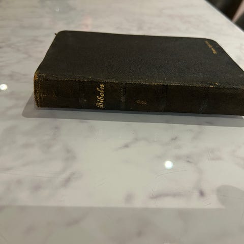 Bibeln är en röd läderinbunden bok med guldfärgad text och symbol på framsidan. Den innehåller text och illustrationer och har två inbyggda bokmärken i form av ett rött och ett guldfärgat band. Boken är avsedd för läsning och studier av religiösa texter.