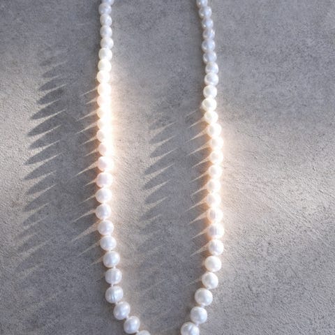 Pärlhalsband med guldfärgat sten-utsmyckat hänge. Halskedjan är ca 40 cm lång och hängsmycket ca 3 cm. Antar att det är syntetpärlor och metallhänge.