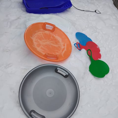 Alfons Åberg pulkor i svart och röd färg. Tillverkade i plast med metallhandtag och draglina. Passar för barnåkning i snö. 100krst
