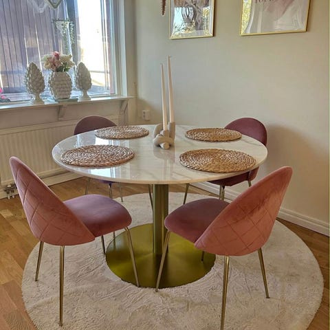 Matgrupp med ovalt bord och sex stolar. Bordet är i måtten 100cm bredd och längd 220cm när mittskivan är på . När man tar bort den blir den ungefär 180 cm. Färgen är i mahogny färg