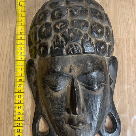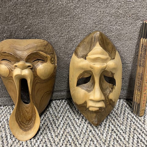Maskerna är tillverkade i Afrika för export under senare delen av 1900-talet. En mask med pärldekoration runt ögonen är äldre och mer påkostad. Övriga är klassiska väggmasker med kraftfulla uttryck.