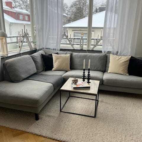 Bra, rymlig och bekväm soffa med avtagbar och tvättbar klädsel på sittkuddar och ryggkuddar. Klädsel på stommen är fast.