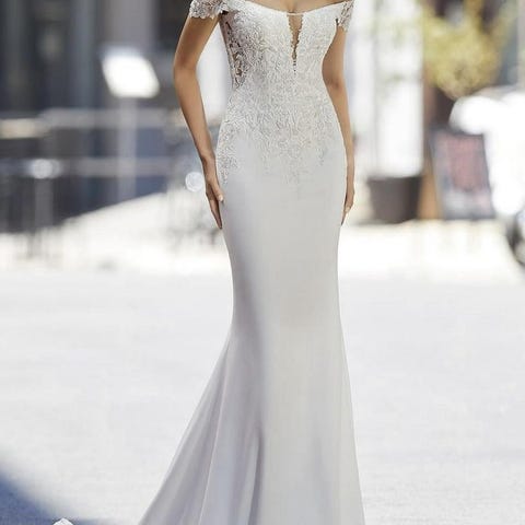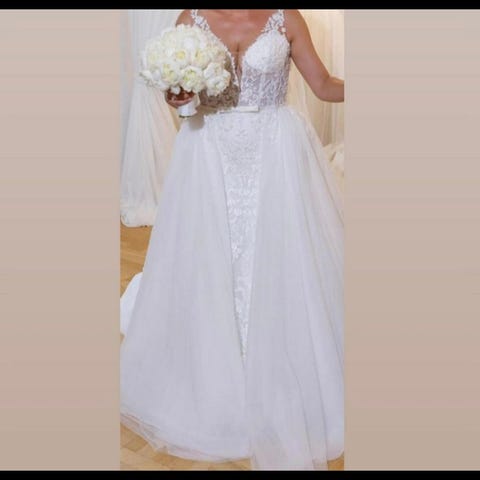 Klänning: Sjöjungfruformad klänning med korsett. Klänningen har ett vackert släp. Dold dragkedja bak men knappar. Axelbanden är omsydda av en professionell skräddare men originalet kan återställas med enkelhet eftersom de är insydda. Använd endast under några timmar 👰🏼 ♀️