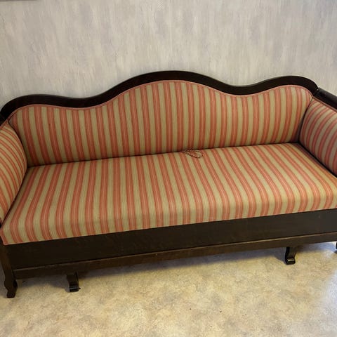 Stor och fin antik soffa i Karl Johan-stil. Massiv och tung, medtag bärhjälp. Någon trädetalj är lite sprucken och sitsen är lagad i en tidigare skarv. Färgbårderna går mer i gammelrosa än på bilderna.