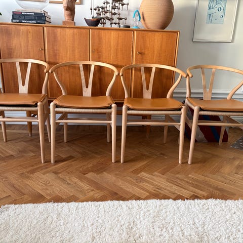 Säljer två CH24 y stolar av Hans J Wegner för Carl Hansen i en snygg stålgrå färg. En del skador i lacken, och den ena sitsen har mörknat ngt men sitsarna är i fint skick så även stolarnas funktion. Se detaljerade bilder för skick, fråga vid behov. 6000kr för vid köp av båda, annars 3500kr/st.