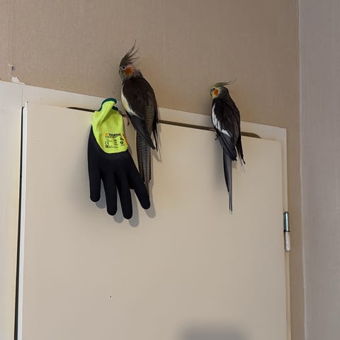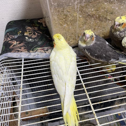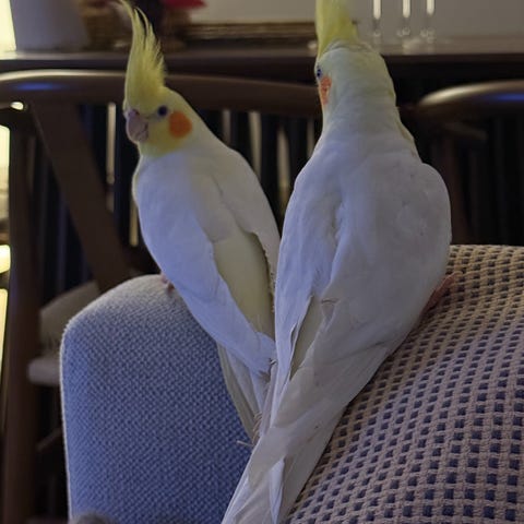 Säljer våra friska nymfparakiter som är 1–1,5 år gamla. De är ett par och har lagt ägg vid två tillfällen. De är inte tama, men man kan stoppa in handen i buren och mata dem försiktigt. Den gula är hane och den grå är hona. Säljes endast tillsammans, ej separat.