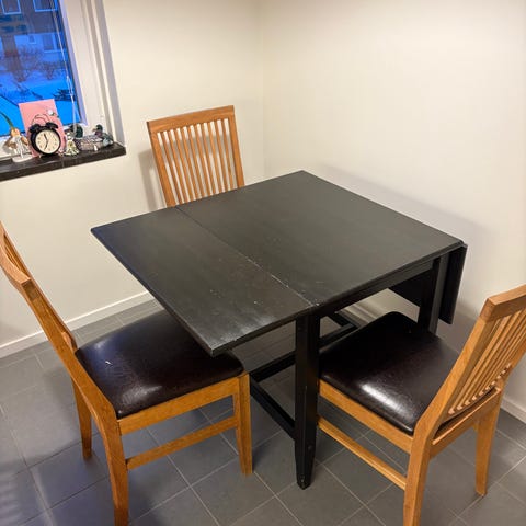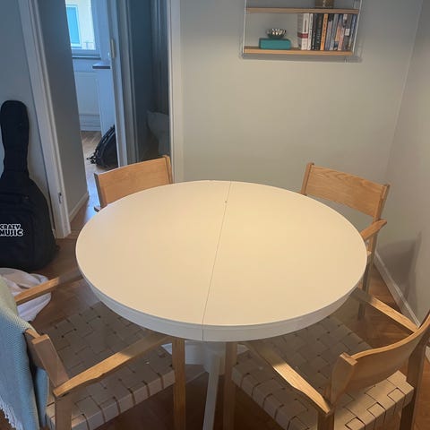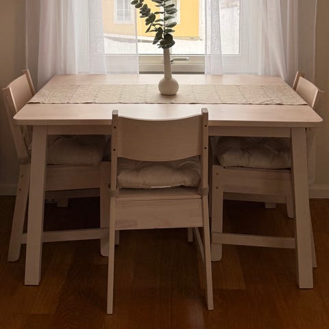 Vitt set med 4 tillhörande karmstolar. Ena stolen något mer slitmärken på sitsen i övrigt i väldigt gott skick. Alltid haft duk på så inga skavanker på bordsytan.