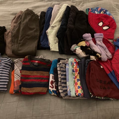 H&M barnkläder för pojke i storlek 62 och blå färg. Kläderna är lämpliga för små barn och inkluderar olika plagg i blå nyanser. 62/68, 18 par byxor, 7 pyjamas, en fleece tröja, 20 par Bodies