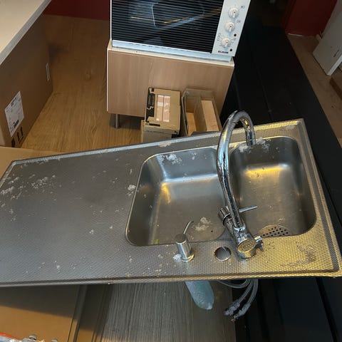 Rostfri diskbänk med plåtskåp och trådbackar. 100 X 60. Blandare ingår inte. Bra skick.