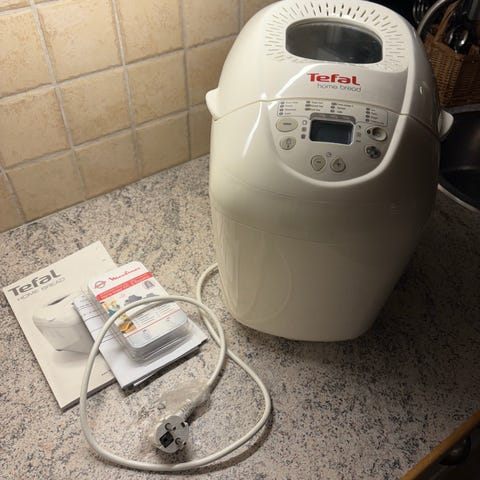 Gleba brödmaskin med digital display och flera inställningar för bakning. Vit färg och kompakt design för köksbänk. Utrustad med handtag för enkel transport.