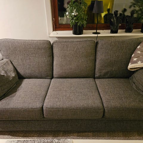 Tresittsig fin soffa i mörkgrått tyg säljes! Det är två breda sittdynor och breda armstöd. Med följer en bekväm nackkudde som lätt placeras bakom en ryggdyna. En stabil soffa som håller formen väldigt väl & är bekväm.