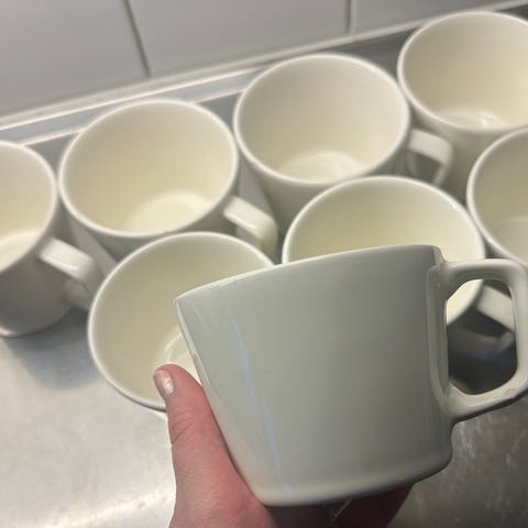 H&M Home kaffekoppar i färgerna lila och rosa. Tillverkade av keramik och avsedda för servering av kaffe eller andra varma drycker.